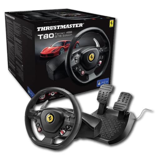 הגה המירוצים החדש מבית thrustmaster העולמית המתמחה באביזרי נהיגה למגוון קונסולות ומחשבים מגיע עכשיו לקונסולת הפלייסטיישן 4 במהדורה מוגבלת ויחודית! הגה – Thrustmaster T80 Ferrari 488 GTB Edition, הכולל בתוכו דוושות גז וברקס, עם מנוע ייחודי המותאם לחוויית נהיגה בכל תנאי השטח ומאפשר אדפטציה מדהימה של התחושה בהגה בהתאם לנהיגה!