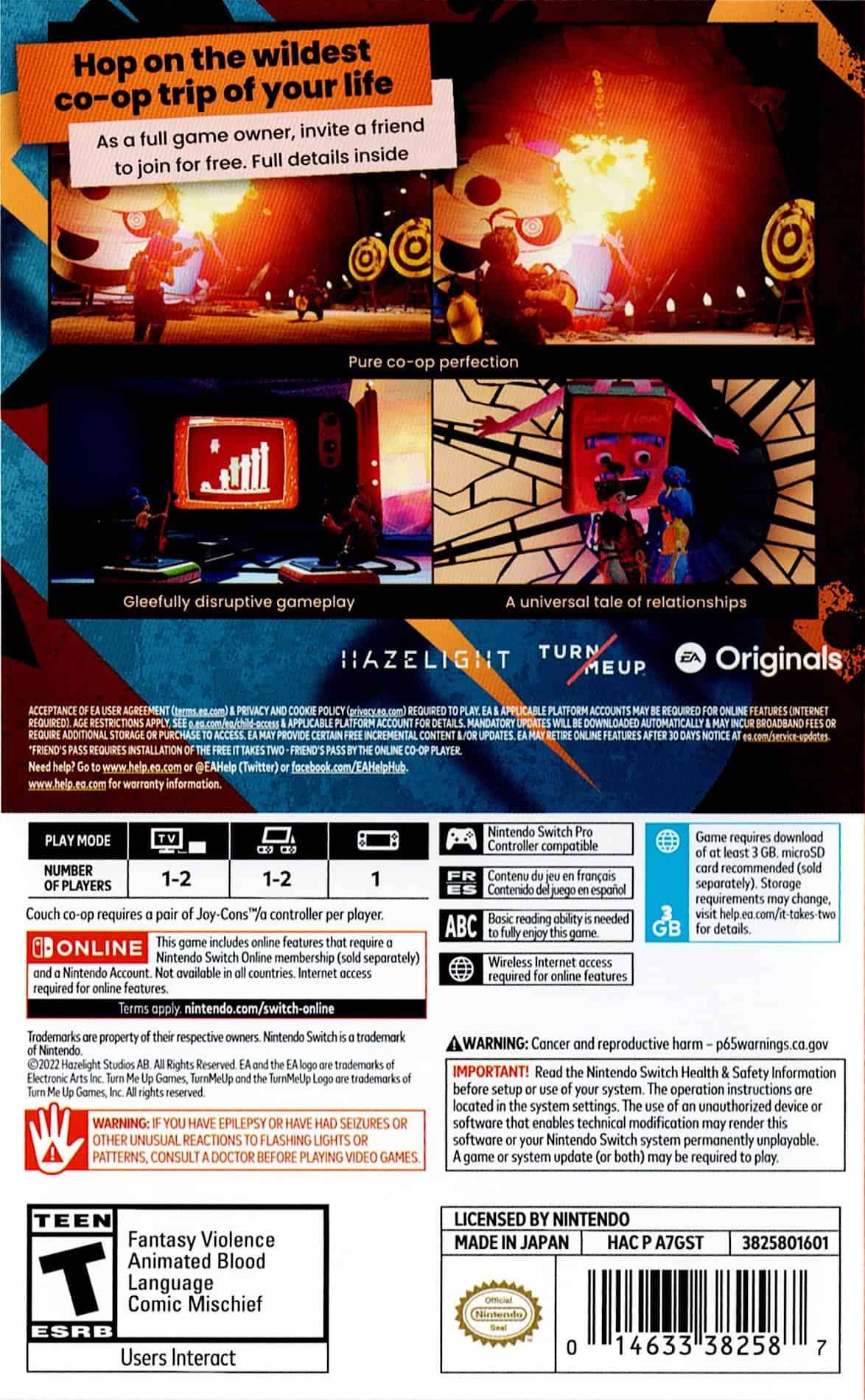 - שני שחקנים בלבד: המשחק מחייב שיתוף פעולה בזוגות, עם אפשרות לשחק במסך מפוצל מקומי או באונליין.
