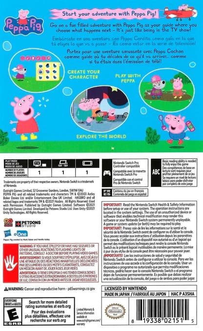 PEPPA PIG SWITCH הוא משחק הרפתקאות חינוכי מבית "פפה פיג", המיועד לילדים צעירים ויוצא על פלטפורמת נינטנדו סוויץ'. המשחק עוקב אחרי הדמויות המוכרות מהסדרה המצליחה "פפה פיג", ומציע לילדים חוויה אינטראקטיבית ומעשירה בה הם יכולים לחקור, ללמוד וליצור בסביבה צבעונית וידידותית.